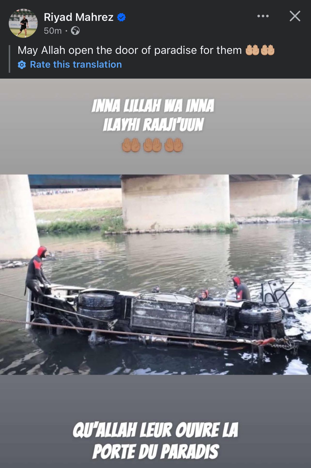 ووضع قائد المنتخب الوطني رياض محرز منشور عبر حساباته الرسمية على منصات التواصل الاجتماعي، أبدى من خلالها حزنه الشديد ازاء هذا الحادث الأليم والفاجعة التي ألمت بكل الجزائريين، حيث قال النجم السابق لمانشستر سيتي الانجليزي في منشوره:” فليفتح الله لكم أبواب جنته.. رحمكم الله”.